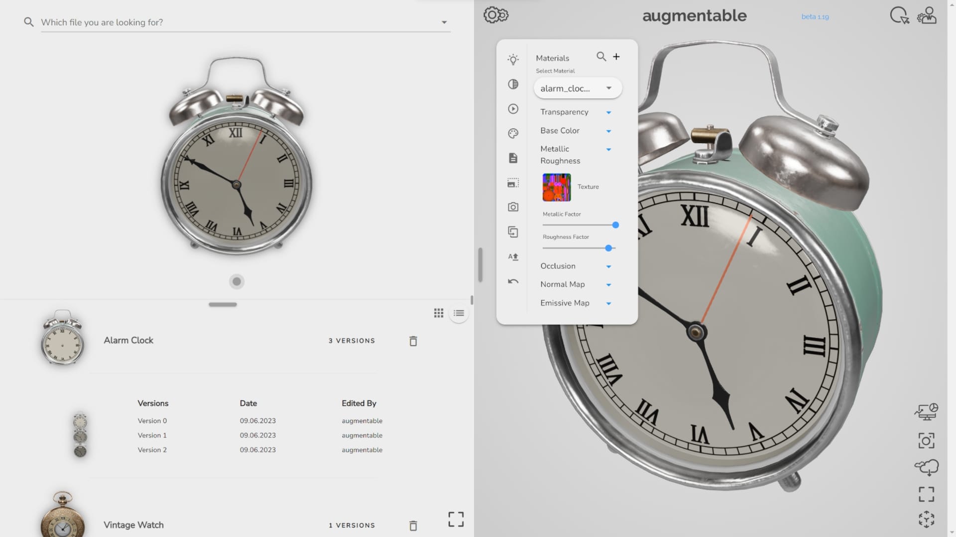 Als 3D-Asset-Ersteller ist es wichtig, einen Referenz-Viewer zu haben, der sowohl Animationen als auch Materialwerte korrekt darstellt. Wir haben die Viewer-Oberfläche so gestaltet, dass Drag-and-Drop-Funktionalität im rechten Bereich möglich ist, während alle anderen Modelle und Versionen über das kompakte CMS geladen werden können. Die erweiterbare Viewer-Oberfläche ist das Kernelement, das verwendet und darauf vertraut wird, um beeindruckende 3D-Modelle für jeden Online-Shop, jedes Spiel oder jede interaktive XR-Anwendung zu erstellen.