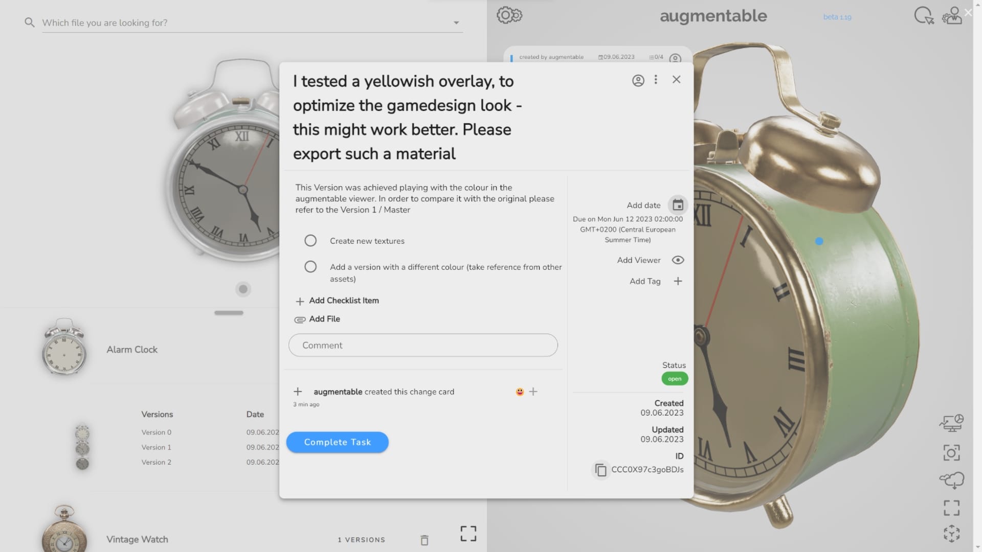 You can use the details page and change cards to track all changes and manage them as Kanban-style tasks. In this way, you can safely move even high-end assets from first version to release.