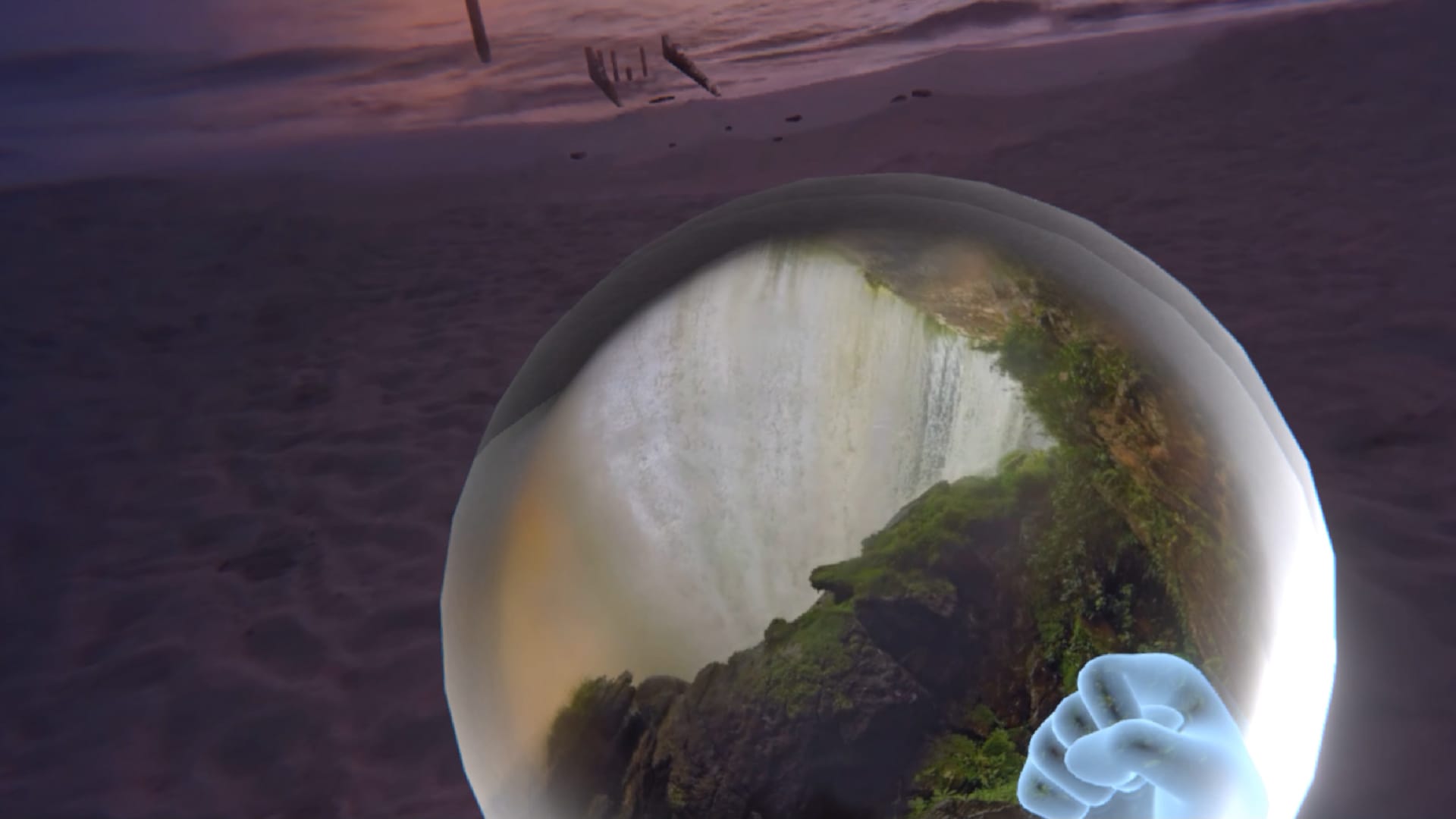 What I think was a more special use and a really ingenious implementation for the experience design, and ultimately worked great, was playing videos on geometry. To create the real feeling of being in the scene and to increase the immersion, I added different particle effects. In the desert, sand particles. In the waterfall scene water vapor and in the snow scene in alaska lightly trickling snow.