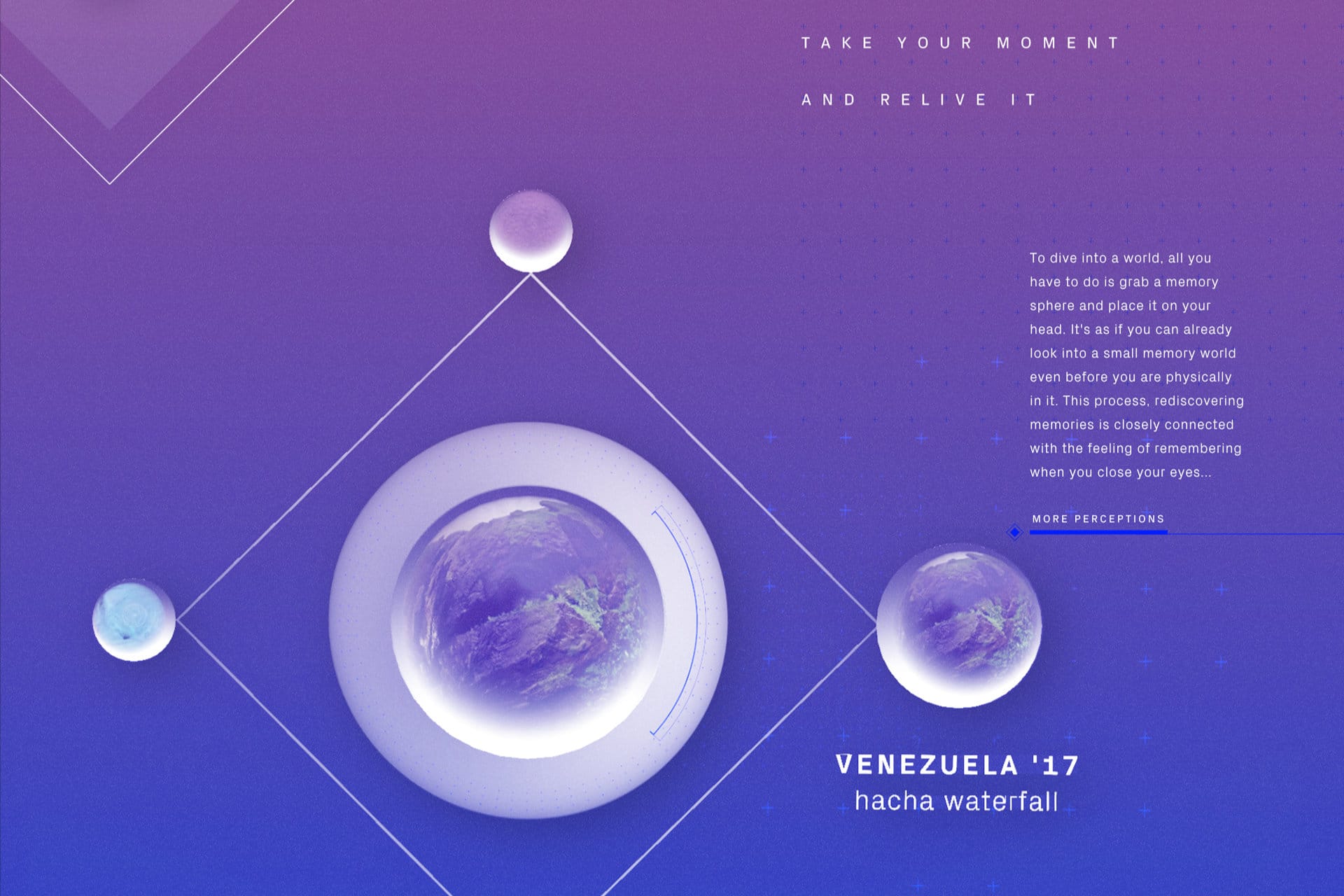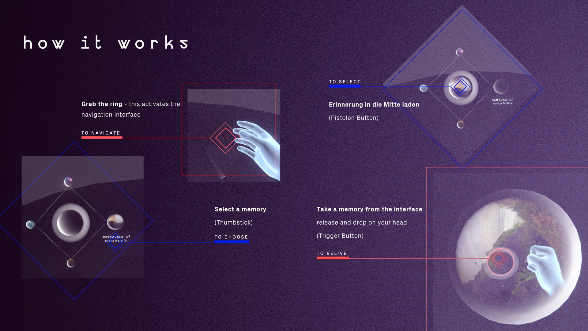 Das Interaktionskonzept basiert auf einer gerätetypischen Controller-Interaktion, die behauptet, nativ und responsiv zu sein. Erinnerungswelten sind in Kugeln gespeichert, die von der Schnittstelle gelöst und auf den Kopf gesetzt werden können.